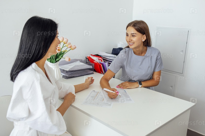 В салон красоты или клинику. Две молодые улыбающиеся кавказские женщины общаются. Косметолог или врач записывает информацию о клиенте или пациенте