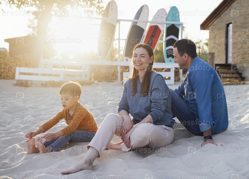 Радостная супружеская пара серферов со своим милым мальчиком на пляже
