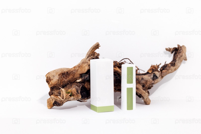 Макет цилиндрической бутылки для крема и пластиковой банки с зелеными коллагеновыми повязками на глаза