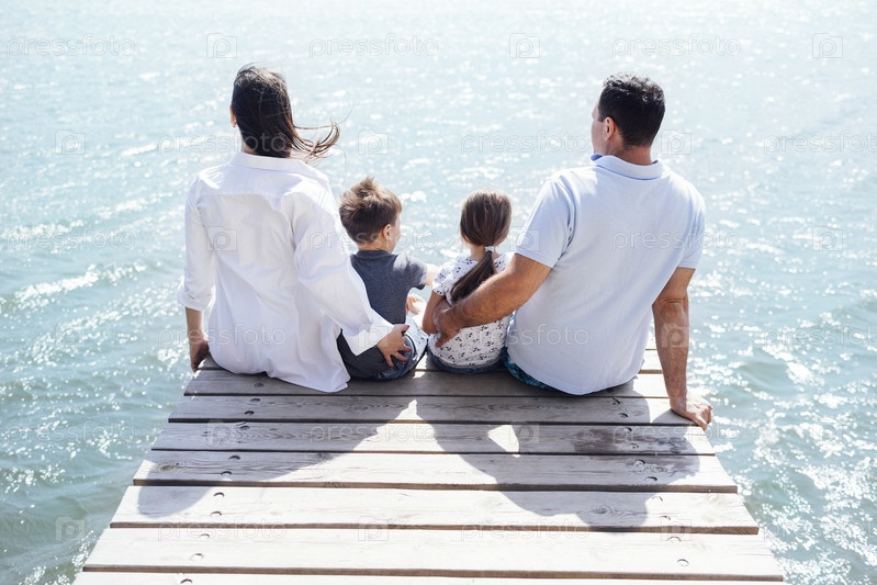 Счастливая семья на деревянном мосту на фоне моря или озера. Мама обнимает сына. Папа обнимает свою дочь