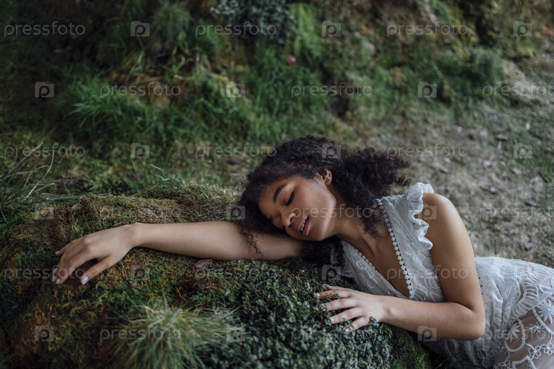 Мода и красота снимают очаровательную девушку смешанной расы в длинном платье