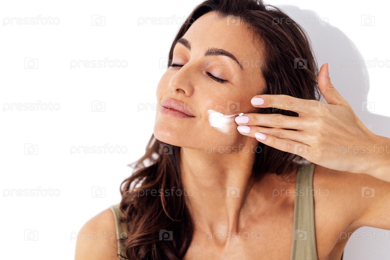 Красивая кавказская женщина мажет щеки кремом. Молодая брюнетка улыбается с закрытыми глазами