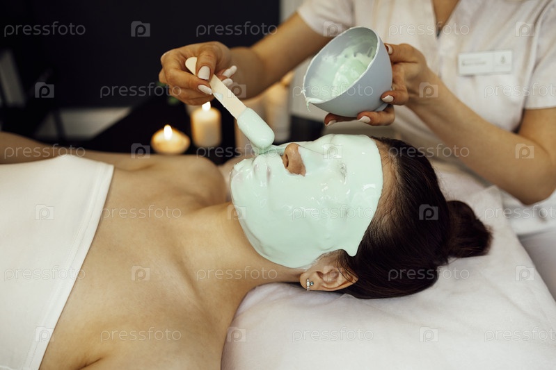 Косметолог наносит альгинатную маску на женское лицо с гладкой мягкой кожей