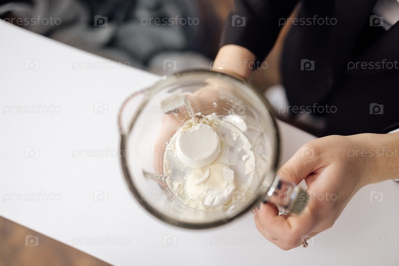 Женские руки держат стеклянную банку стационарного блендера с белым порошком для приготовления здорового коктейля