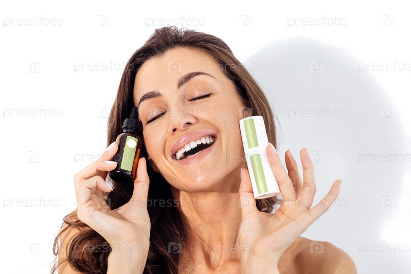 Красивая смеющаяся кавказская женщина держит в руках макеты белой трубки и коричневой бутылки с сывороткой с пепиттой с зелеными наклейками в руках