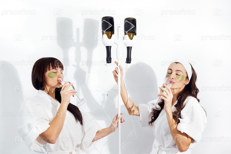Смеющиеся подруги в белых халатах и с повязками под глазами