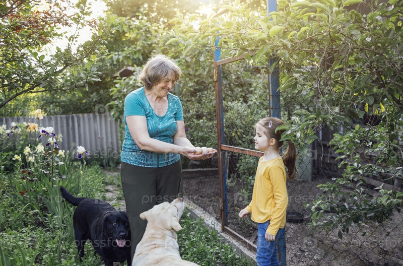 Счастливая бабушка и внучка смеются и смотрят на куриные яйца