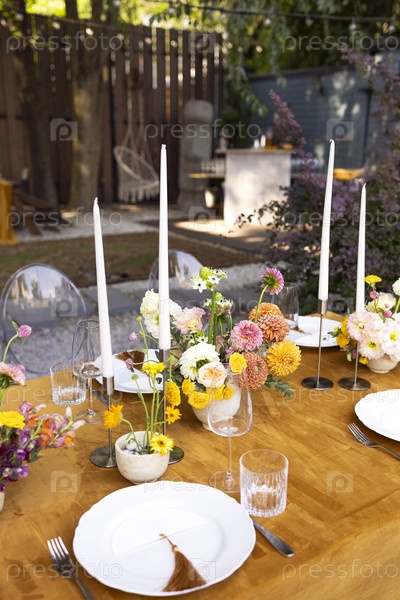 Прически и стол для гостей, украшенный свечами, сервируется столовыми приборами и посудой