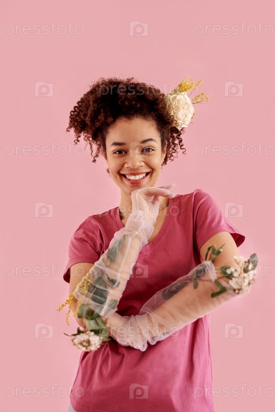 Счастливая молодая улыбающаяся женщина африканского происхождения в розовой одежде, прозрачных перчатках и цветах