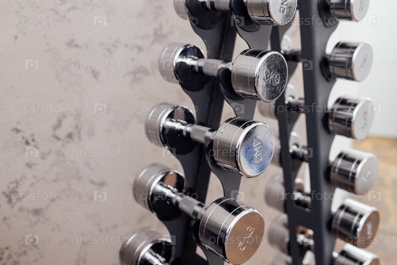 Закройте стойку современными металлическими гантелями. Спортивное оборудование в тренажерном зале или фитнес-клубе