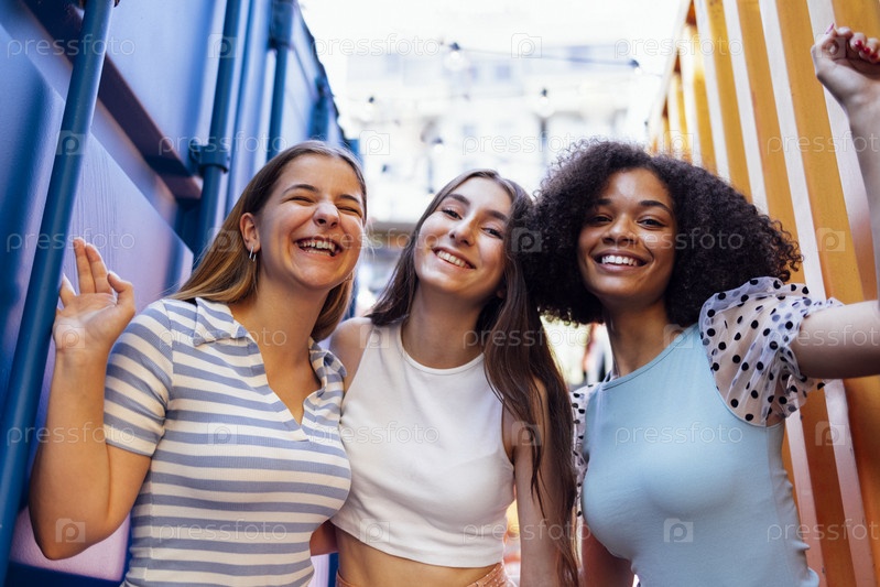 Три милые девочки-подростки в повседневной одежде на фоне разноцветных транспортных контейнеров