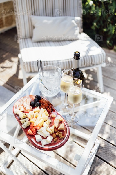 Макет бутылки вина с пустыми наклейками. Ледяной холодильник, два бокала шампанского и тарелка вкусного десерта на стеклянном столе