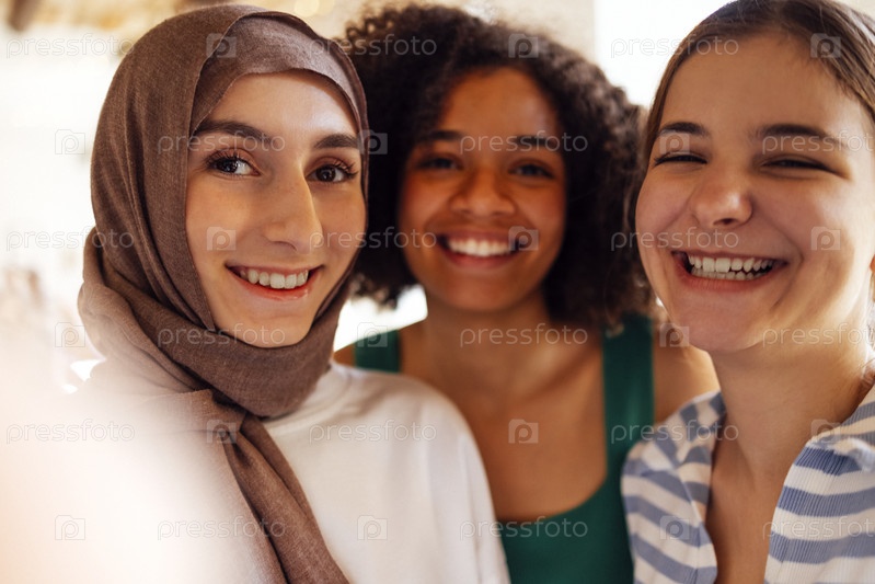 Крупным планом портреты трех улыбающихся девочек-подростков. Мусульманин в хиджабе, афроамериканец и белые подруги