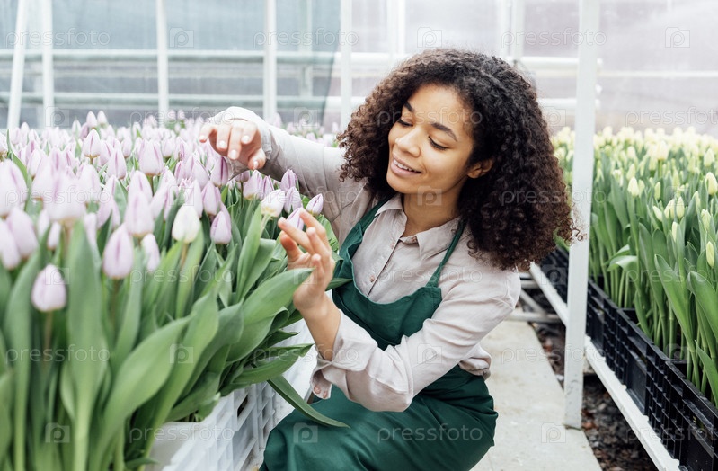 Улыбающаяся темнокожая работница теплицы проверяет состояние рассады