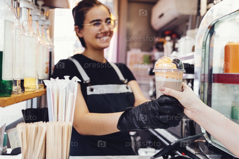 Улыбающаяся молодая девушка-бариста в повседневной одежде, фартуке и черных перчатках дает своему клиенту коктейль со сливками и печеньем