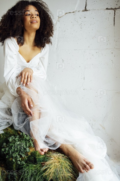 Мода и красота снимают очаровательную девушку смешанной расы в длинном платье