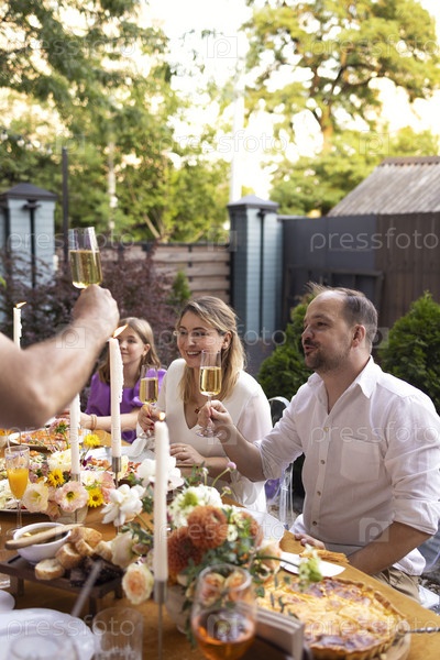 Многие люди приветствуют и показывают свои бокалы с шампанским. Свадебная вечеринка