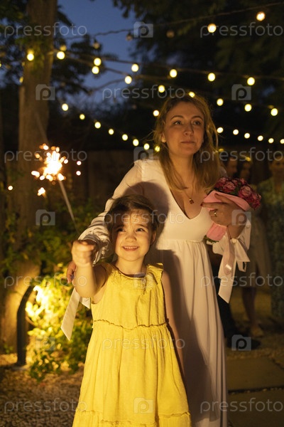 Мать-невеста с маленькой милой дочерью, держащей горящие бенгальские огни на улице на свадьбе
