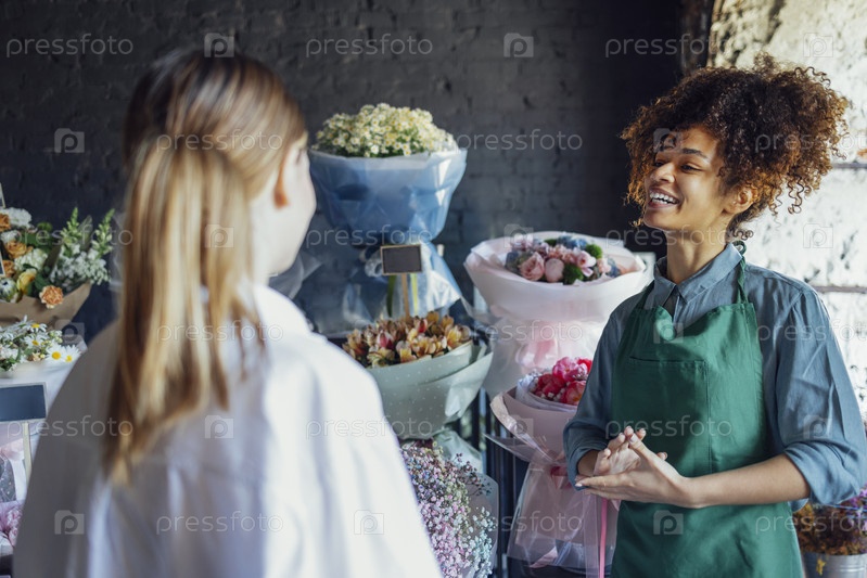 Счастливая чернокожая женщина-предприниматель, стоящая в магазине растений и продающая клиенту свежие цветы