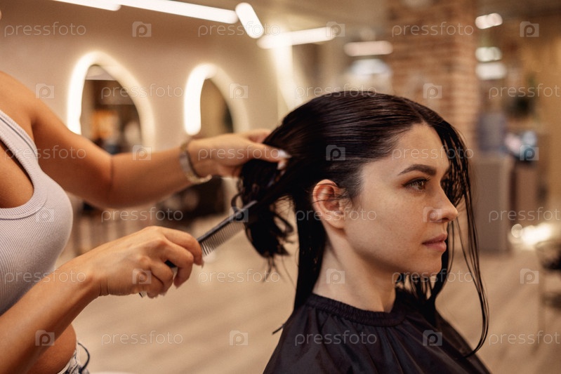 Парикмахер стрижет волосы женщины во время работы в салоне красоты