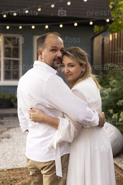 Свадебная пара средних лет наслаждается романтическими моментами на свежем воздухе в летнем саду