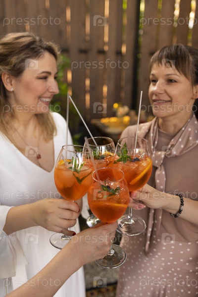 Счастливые друзья проводят время вместе, пьют коктейль Aperol spritz