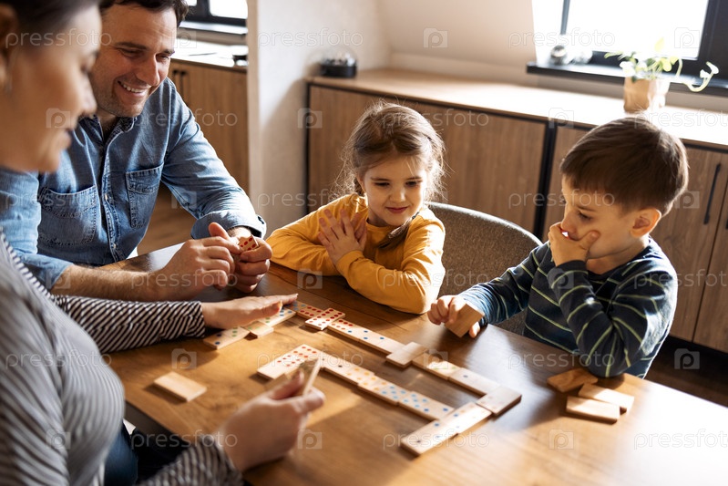 Мать, отец и дети играют в домино, сидя в гостиной у окна