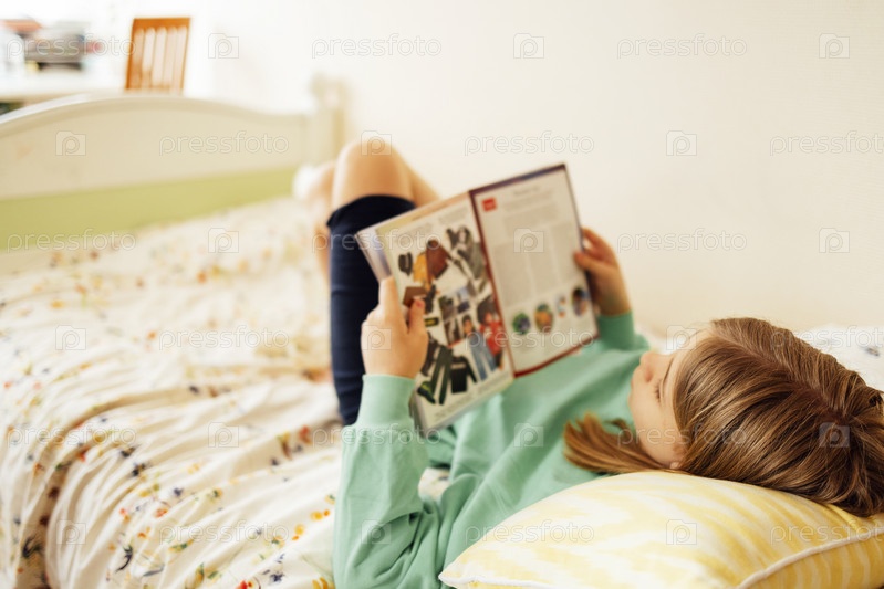 Милая девочка-подросток читает модный журнал в спальне дома