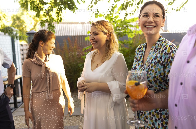 Счастливые подруги проводят время вместе, молодая женщина пьет коктейль Aperol spritz