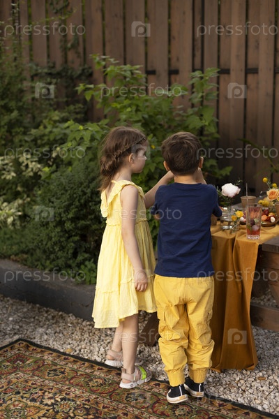 Дети на вечеринке по случаю дня рождения, маленькая очаровательная девочка и мальчик с лимонадным напитком, используя соломинку
