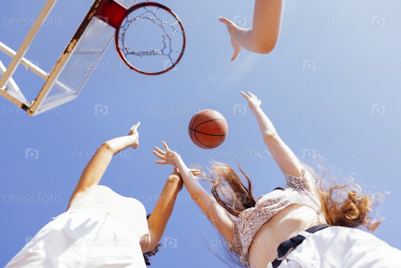 Стильные крутые девочки-подростки собираются на баскетбольной площадке, друзья играют в баскетбол на открытом воздухе