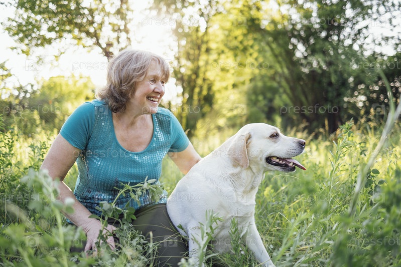 Пожилая седая женщина со своей собакой в парке