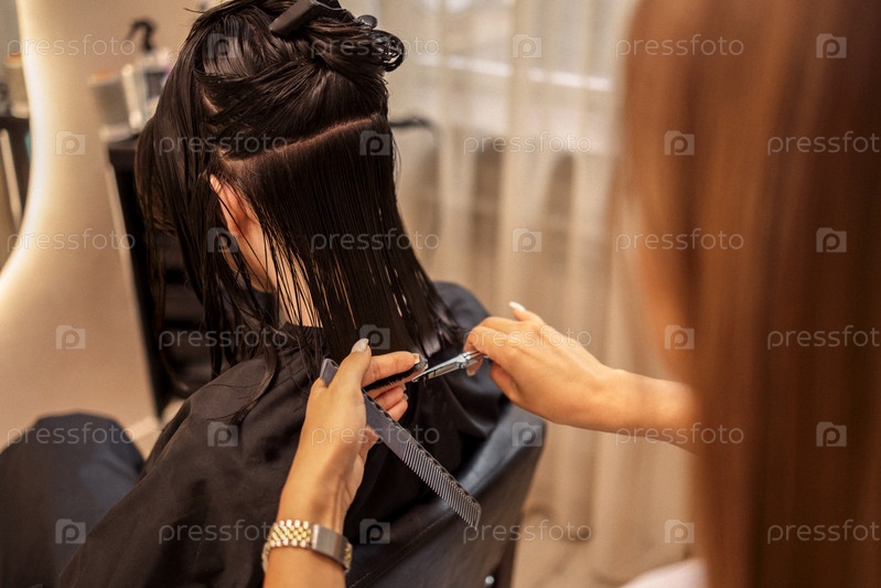 Парикмахер стрижет волосы женщины во время работы в салоне красоты