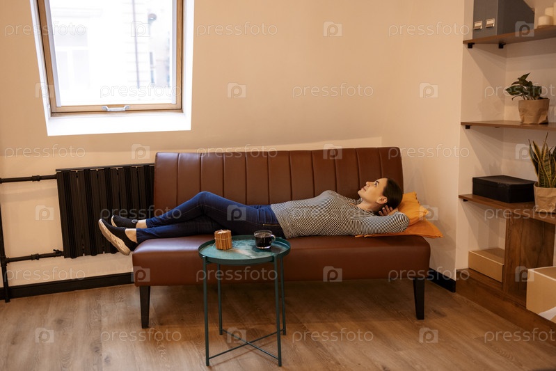 Безмятежная домохозяйка, гостиная, сидящая на диване, чувствующая усталость, держащаяся за руки за головой