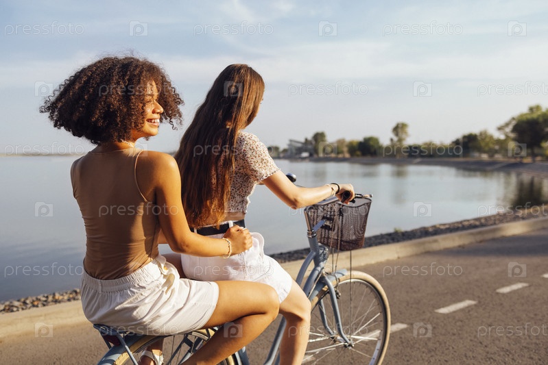 Подростки разных национальностей и внешности на велосипедах едут по улице города. Молодые и позитивные девушки улыбаются вместе