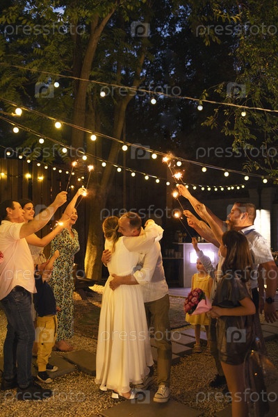 Жених, невеста и гости свадьбы с горящими бенгальскими огнями на открытом воздухе