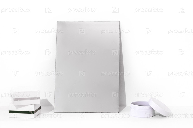 Косметический макет пластиковой банки с пластырями или кремом и двух квадратных картонных коробок. Посередине прямоугольное зеркало