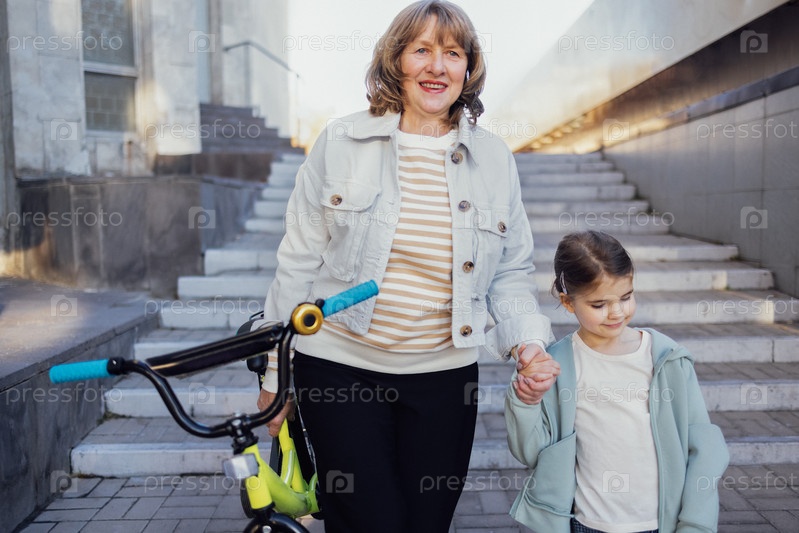 Молодая бабушка учит свою милую маленькую внучку кататься на велосипеде