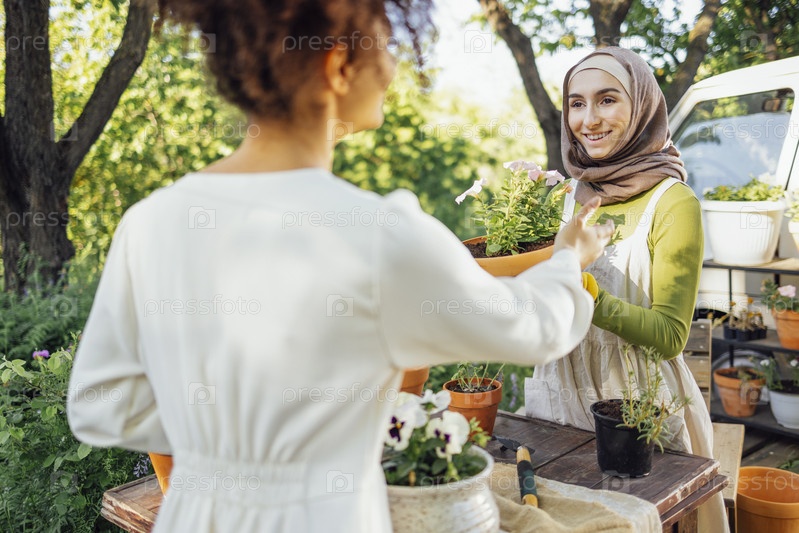 Мусульманский молодой привлекательный садовник за работой, заботится о зеленом растении
