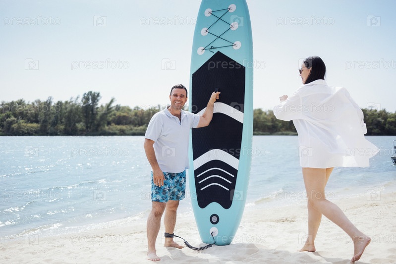 Пара серферов на пляже. Мужчина стоит с веслом и улыбается. Он ждет своего партнера. Молодая красивая женщина в солнечных очках и белой рубашке бежит к своему парню