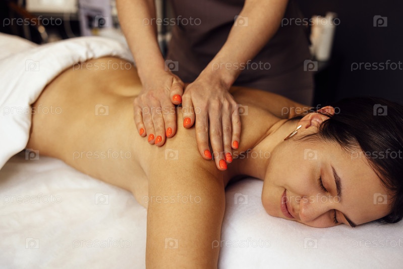 Счастливая молодая кавказская девушка получает массаж спины в спа-салоне. Аккуратные руки массажистки с оранжевым маникюром