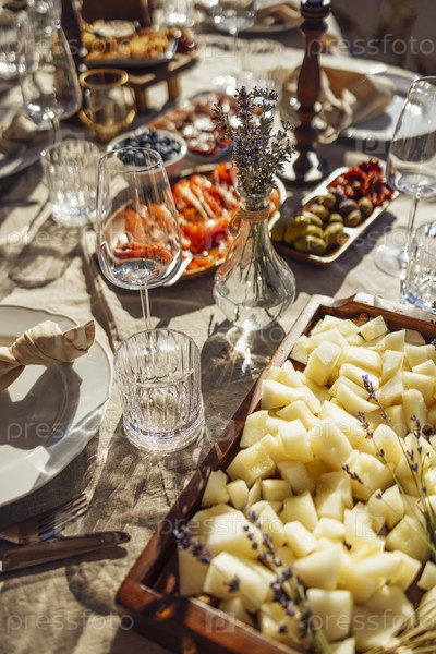 Прически и стол для гостей, украшенный свечами, сервируется столовыми приборами и посудой