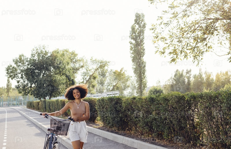 Темнокожая девочка-подросток едет на велосипеде. Молодая и позитивная афроамериканка в повседневной одежде мило улыбается и веселится