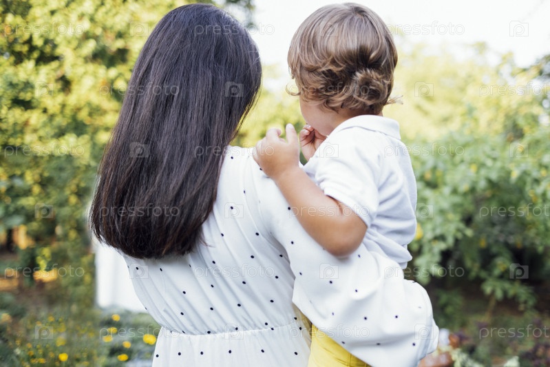 Крупный план молодой брюнетки, касающейся своего милого ребенка