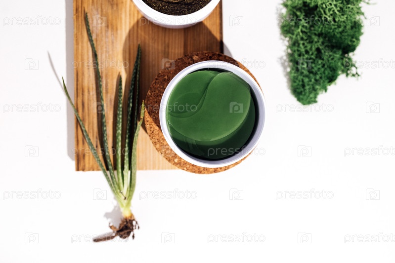 Пластиковая банка с зелеными коллагеновыми повязками для глаз на пробковой подставке. Растение алоэ, деревянная форма и мох на заднем плане