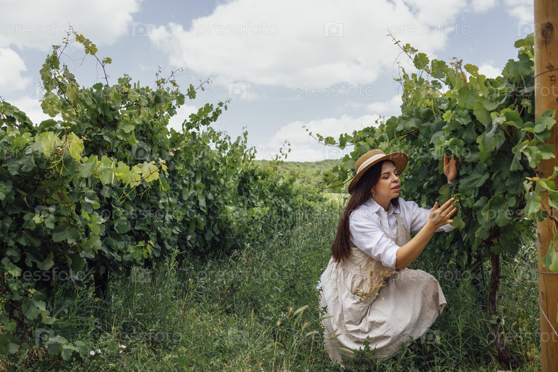 Молодая красивая женщина ухаживает за виноградником. Кавказская красивая девушка в бежевом сарафане, белой рубашке и соломенной шляпе рассматривает зеленые грозди винограда