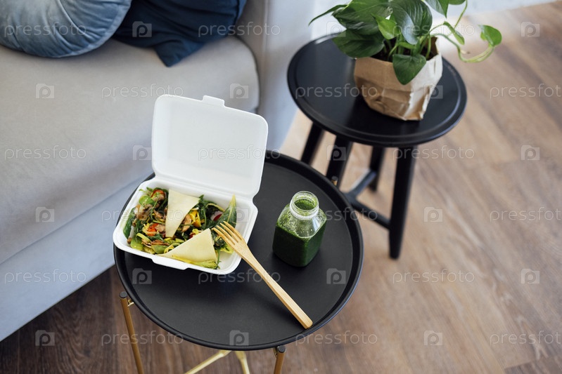 Закройте еду на вынос в белом контейнере с деревянной вилкой и пластиковой бутылкой зеленого смузи