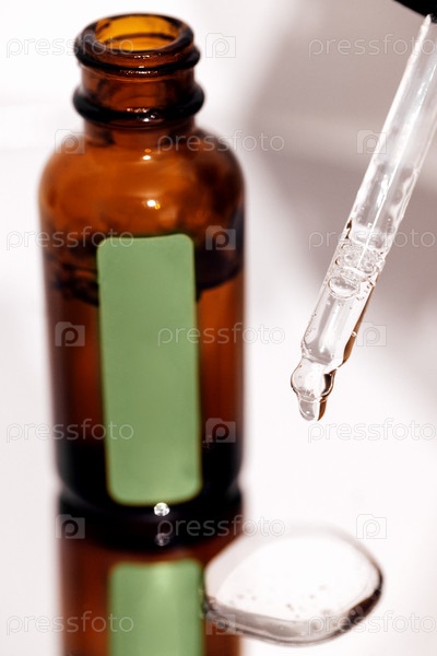 Крупный план коричневой сыворотки или масляного стекла с зеленым стикером на бутылке на зеркальном фоне
