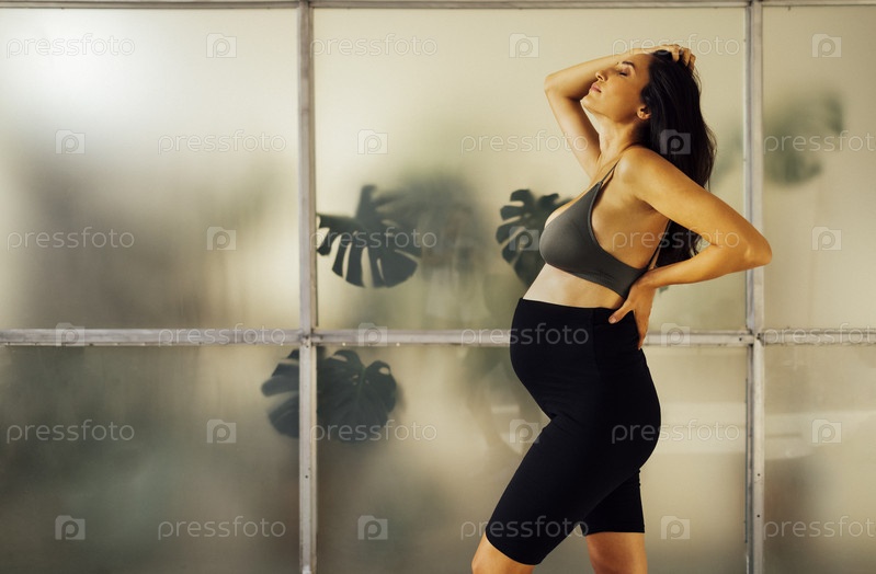 Красивая молодая беременная женщина в спортивном топе и леггинсах