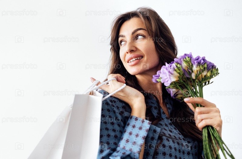 Молодая красивая женщина с удовольствием нюхает букет цветов
